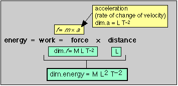 Solution: When mechanical work is performed on a body, its energy increases by the amount of work done, so the two quantities are equivalent and we can concentrate on work. The latter is the product of the force applied to the object and the distance it is displaced. From Newtons law, force is the product of mass and acceleration, and the latter is the rate of change of velocity, typically expressed in meters per second per second. Combining these quantities and their dimensions yields the result shown here.