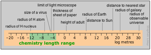 Chemists tend to work mostly in the moderately-small part of the distance range. Those who live in the lilliputian world of crystal- and molecular structures and atomic radii find the picometer a convenient currency, but one still sees the older non-SI unit called the Ångstrom used in this context; 1Å = 1010 m. Nanotechnology, the rage of the present era, also resides in this realm. The largest polymeric molecules and colloids define the top end of the particulate range; beyond that, in the normal world of doing things in the lab, the centimeter and occasionally the millimeter commonly rule.